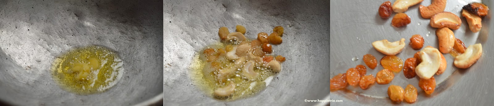 - In a Pan add in the ghee once it melts add in the cashew nuts and raisins roast till the raisins plump up[ and cashew nuts turn golden brown. Remove them from the pan and set it aside.