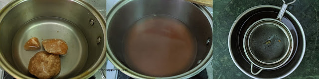 4. Add the Jaggery in ½ cup of water, cook till the jaggery is completely dissolved in water, switch of strain the impurities and set aside.