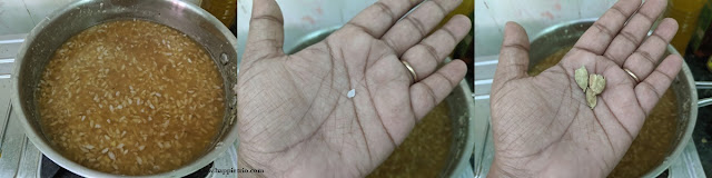 6. To this add in the Jaggery water and mix well. Next add in the edible camphor and crushed cardamom pods.