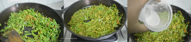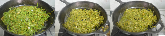 2. Slice the broad beans lengthwise and keep it ready. Once the onions are cooked add in the broad beans.
