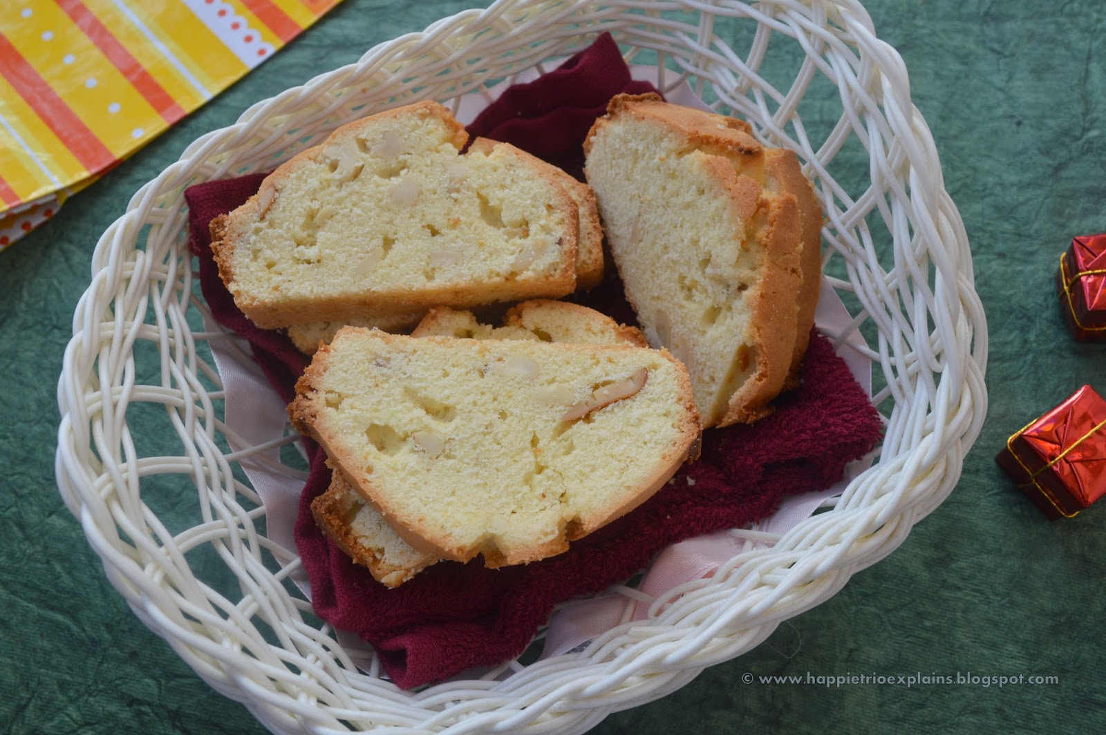 - Grease and line a loaf pan with parchment paper and the preheat the oven at 180 Deg C for about 10 mins and bake at 180 Deg C for about 30 mins or till a tooth pick when inserted comes out clean ,Allow it to cool completely and then slice into pieces.