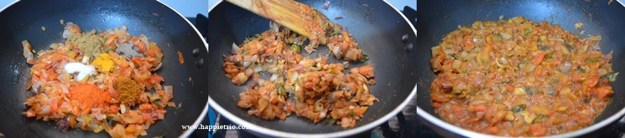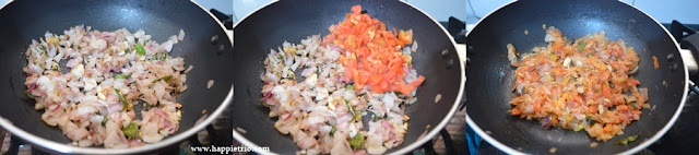 3. Saute till glossy and then add in chopped tomatoes. Cook till it gets mushy.