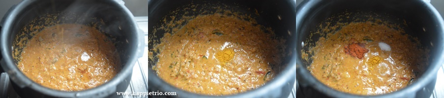 - Grind the spice paste and keep it ready .Add in chopped tomatoes in the cooker. Once it is mushy add in the ground masala paste.