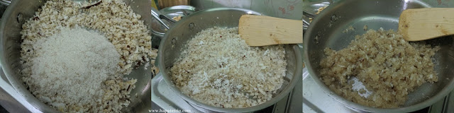 2. In a pan add in the Grated Coconut and start roasting in a low flame. Add in the Sugar too.