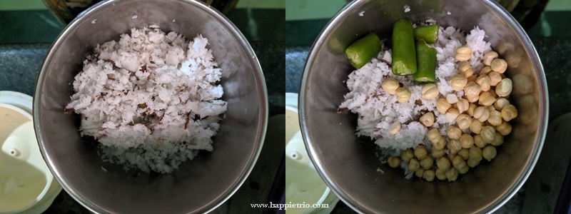 1. In a blender add in the grated coconut, Green Chilli and potukadalai.