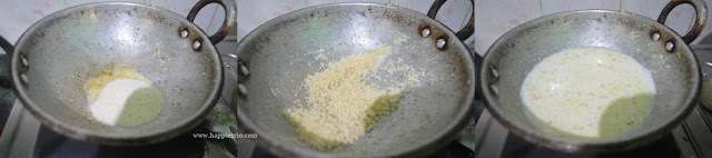 3. Heat the pan with the remaining ghee and roast the rava till a nice aroma. To this add in the milk and continue cooking.