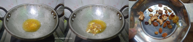 - Heat a pan with 1 tsp of ghee fry the cashew nuts and raisins till golden brown remove and set it aside.