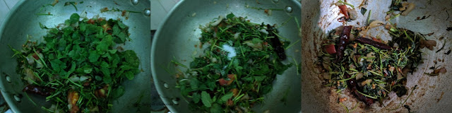 - Next, add in the Mint Leaves, Saute well in a medium flame till the coriander leaves and mint leaves shrink. Add in the required salt.
