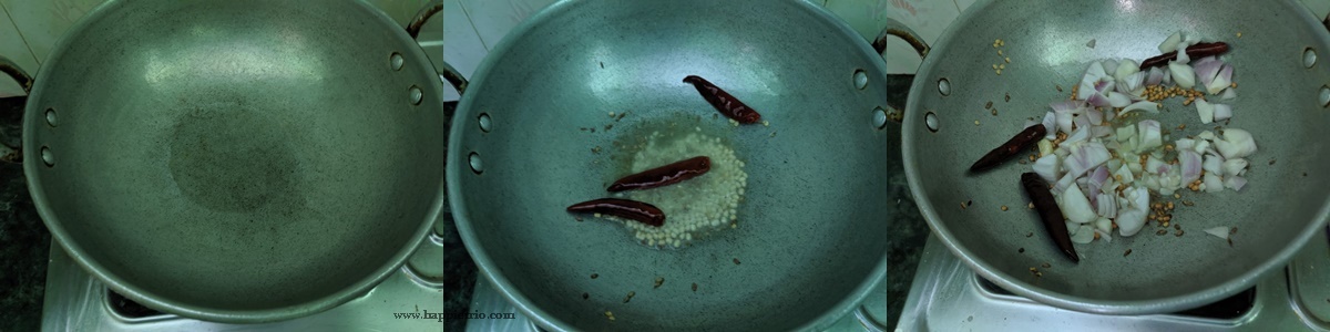 - Heat a Kadai with oil, once its hot add in Urad Dal and Dry Red Chilli saute till its golden, Next add in the Onion.