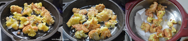 - Heat a pan for shallow frying with oil, now take the cooked cauliflower florets and dip in the egg such its coasted fully and shallow fry.