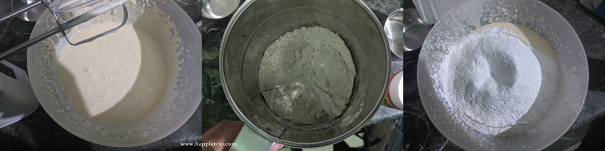 3.Now sift in the dry ingredients, flour, baking powder and baking soda together with a sieve and add it slowly to the wet ingredients.
