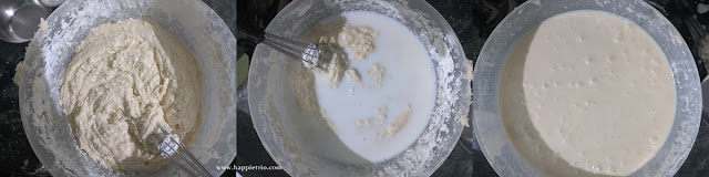 4.Whisk everything together. Next, add in the hot milk. Let it not be boiling hot. Combine everything together with a hand mixer and form the batter.
