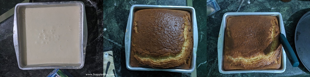 - Line a baking tin with parchment paper and then pour in the batter. Tap the baking pan once so that there are no air bubbles. Preheat the oven at 180 DEg C for 10 mins and then bake the cake at 180 Deg for about 50 mins.