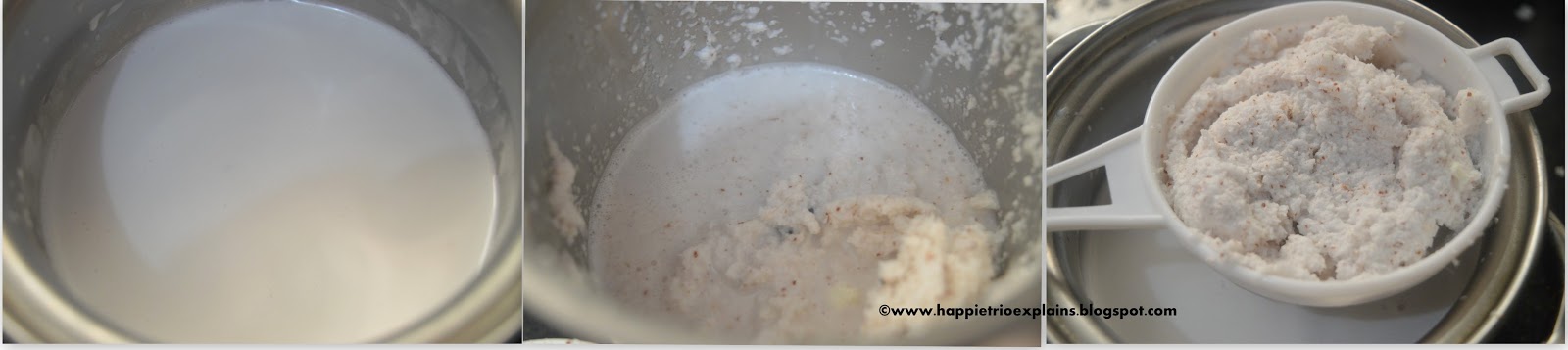 1) Break Open a coconut and grate the coconut. Now take the grated coconut in a blender or food processor and add in 1 cup of water. Blend it to a fine paste. Now take the ground coconut from the blender and strain it using a strainer. Press the coconut in the strainer in such a way that all the coconut milk has been strained out.