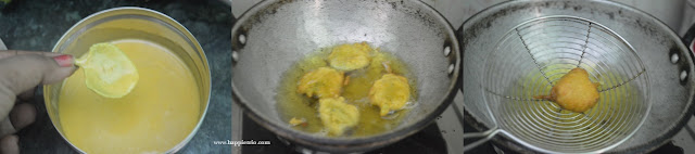 - Dip the leaves in the batter such that its fully coats and then deep fry in hot oil in a medium flame until the bajji is golden or fully cooked. Drain in a kitchen towel and remove the excess oil. Serve hot.