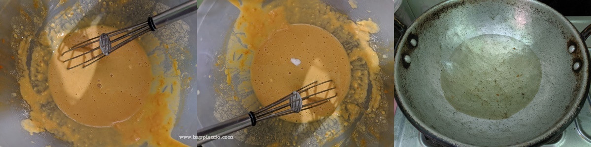 2. Add Water little by little to form a thick batter. Add in the Cooking Soda and Dosa batter and whisk well, Set it aside for 10 mins. Heat oil in a pan for deep frying.