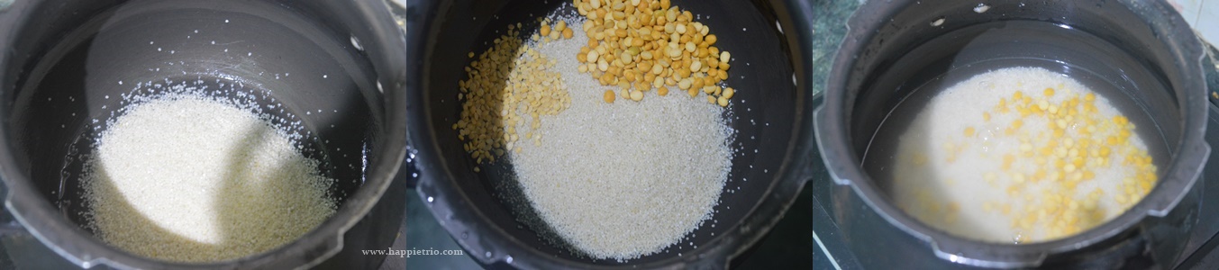 - Soak the Moong dal and channa dal in the water of 3o mins. In a pressure cooker add in the little millets along with moong dal and channa dal and add ½ cup of water Pressure cook for 3 whistles in a low flame.