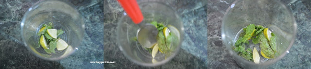 - Take a serving glass to this add in the lemon wedges and Mint leaves. Crush it nicely and then add in the crushed ice cubes.
