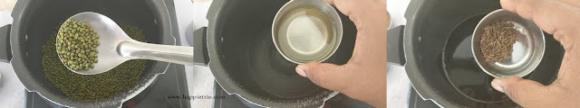 - Wash the green moong and set it aside. In the same cooker heat a tbsp of oil ,once its hot add in the cumin seeds and pepper corn .