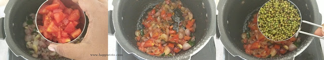 5. Next add in the tomatoes and cook till it leaves oil. Now add in the washed green moong dal.