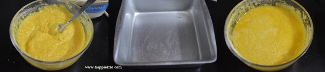- Finally microwave for 1 more min so that you get the caramelized and pours mysore pak and pour the mixture in the greased pan.