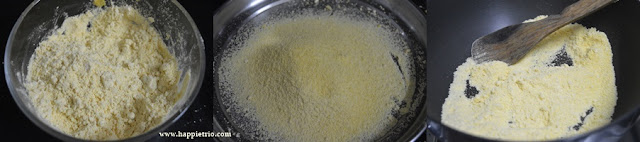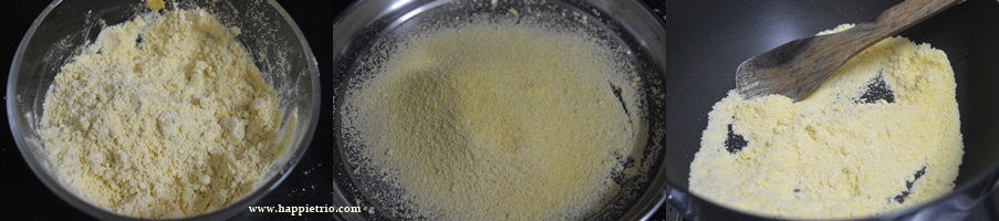 - Rub the flour and ghee with fingers so that it resembles crumbs .Next sift the flour and then dry roast the besan flour until a nice aroma comes and set the flour aside.