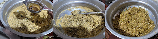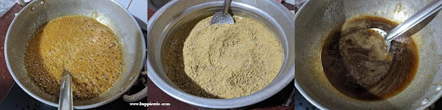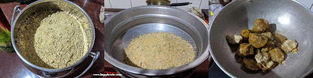 - Now filter the cooled Palm Jaggery and add it to the powdered green gram and coconut mixture. Mix well and till the Palm Jaggery is fully done.