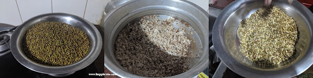 - Dry Roast the green gram in a low flame until the colour slightly changes brown. Set it aside and cool down. In the same pan roast the grated coconut along with the cardamom pods until the coconut changes slightly golden. Pulse the green gram once and then slowly remove the skin. Repeat this process and remove the skin. You can also ignore this step if you don’t prefer.