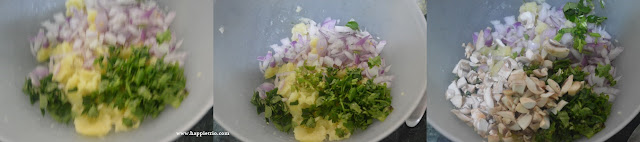 2. In a mixing bowl add in the mashed potatoes, Chopped onions, Coriander leaves.