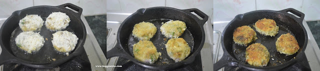 - In a bowl add in the bread crumbs. In another bowl dissolve 1 tbsp of Maida in 2 tbsp of water. Dip the patties in the Maida first and then in the breadcrumbs and set aside. Heat a pan with oil to shallow fry.