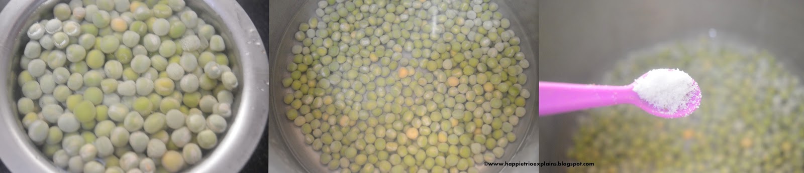 - Take Peas in a large bowl add in water above the level of the peas and soak it overnight. In the morning take the soaked peas in a cooker add in salt and pressure cook for about 4 whistles or till it is done. Make sure the peas do not get mashed.