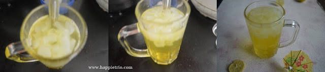 - Now add in the chilled water and mix well. Finally top it with ice cubes and serve immediately.