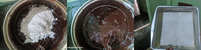 2. Next add in 10 tbsp of flour. Fold gently until the flour is well combined. Now the batter is ready.Preheat a oven at 180 Deg C for 10 mins. Meanwhile transfer the prepared batter to a greased and lined baking pan