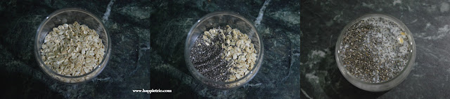 1. In a mixing bowl add in the Rolled Oats, Chia Seeds and Milk. Mix well