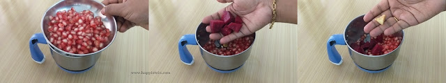 1.In a blender add in 1 cup pomegranate arils and 3 tbsp of beetroot chunks.