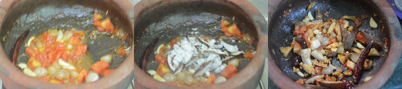 - In a Kadai add in 1 tbsp of coconut oil add in the small onions and saute for 2 mins and then add in the chopped tomato and then add in the dry red chilli and sauté till its glossy.