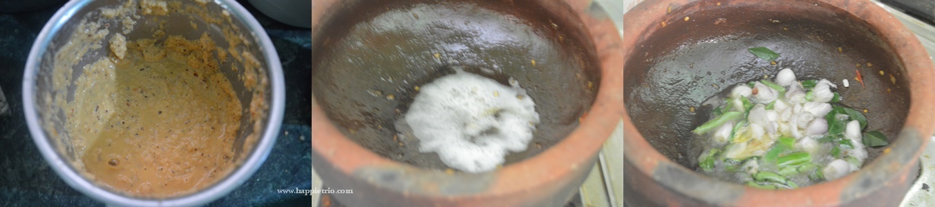 4. Allow it to cool completely and then add in little water and grind it to a fine paste.Heat the same pan and then add in oil add Mustard seeds let it splutter and then add in the fenugreek seeds, Curry leaves and green chilli and saute and then add in the small onions and saute for few mins.
