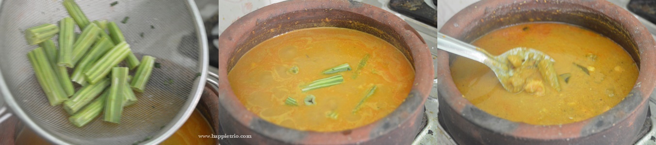 1. Clean and devein the prawns. Chop the drumstick and cook till its 50 % done and set aside. Soak the tamarind in ½ cup water for 30 mins and then extract the juice.