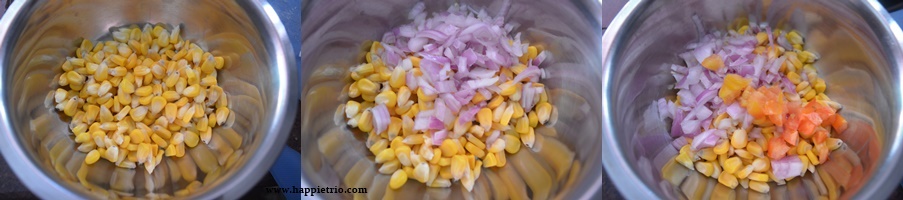 - In a mixing bowl take the Sweet Corn kernels. To this add the Chopped Onions and garlic.
