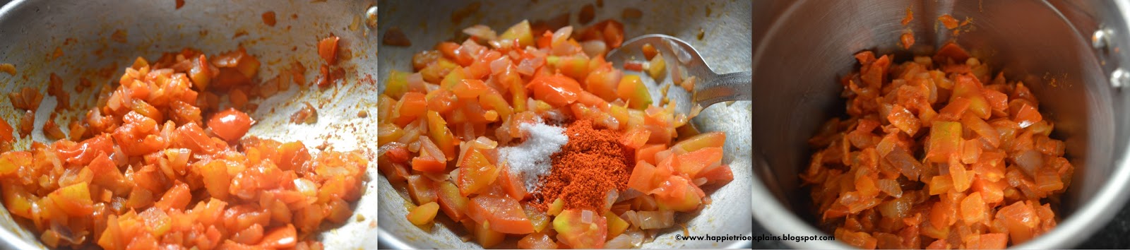 - Sauté the onions for about 3 mins and then add in salt and chili powder and mix everything really well and then cook for about 1 min and then switch off the stove. Allow the tomato-onion mixture to cool down.