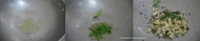 3. In a Kadai add oil, once it heats up add in Mustard Seeds, Curry leaves and then add the crushed Garlic and Pepper corn fry for a min .