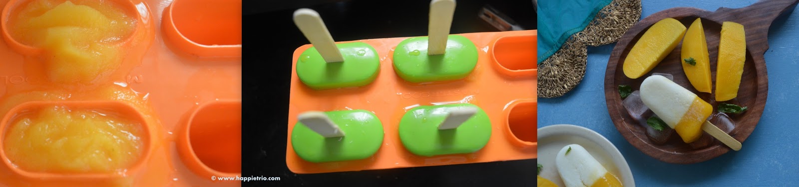 - Now fill the popsicles mould with the Mango Puree and then close with the lid and insert the Popsicles stick. Freeze it for 8 hours or overnight. To release the Popsicle from the mould show them in running tap water and gently release the popsicle form the moulds by holding the lids it will come easily. Serve immediately.