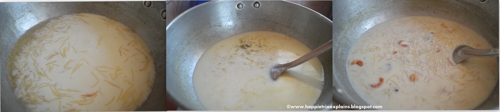 - In a Kadai/Pan add in Ghee and let it heats up fry the Cashew nuts until golden brown and set aside. In the same pan fry the raisins it will plump up then remove it from the pan and set it aside. In the Same pan fry the vermicelli also and set it aside.