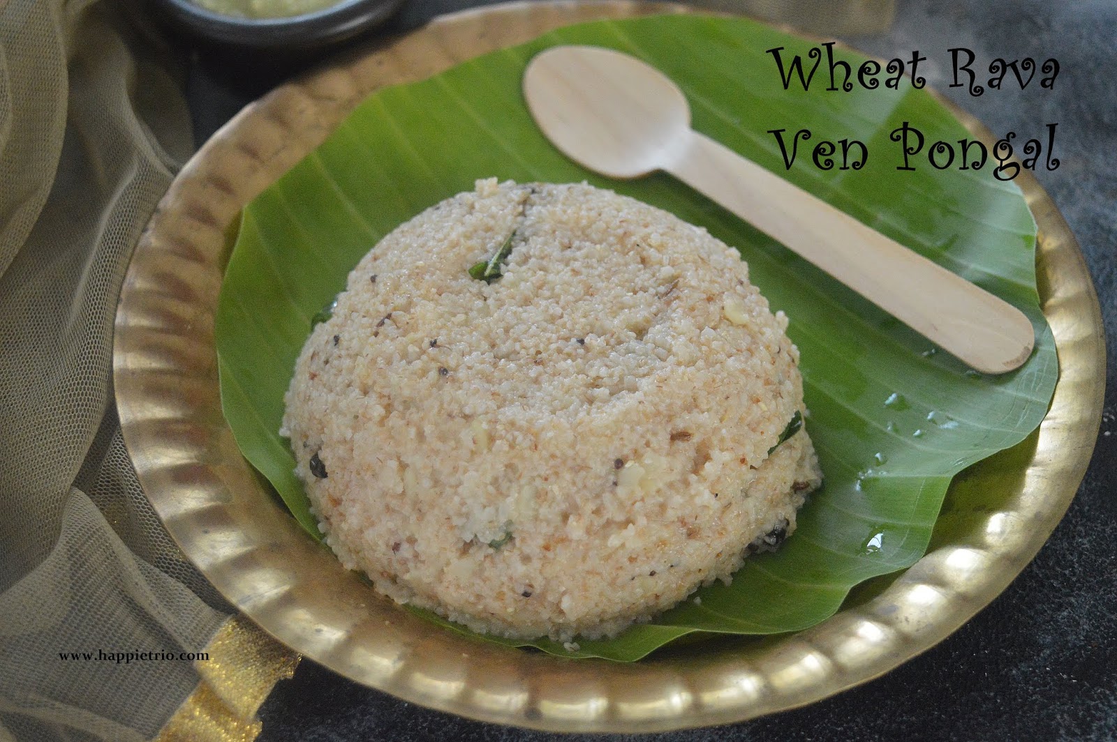 - Next add in the Cashew nuts, crushed ginger piece, Green Chilli and Curry leaves. Fry in a low flame until a nice aroma and then pour this over the cooked Wheat Rava Ven Pongal . Mix well. Serve hot with extra dollop of ghee.